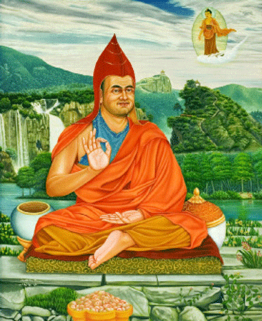 One day, he had a debate with another monk when out of his pride he accused that monk of having an intellect of a woman. At that moment, from the vast radiance of the sun, Arya Avalokiteshvara appeared in the real form and said, “Having uttered unpleasant words out of pride, you shall take many lives as a woman, yet I shall never leave you alone, but guide you as a teacher- until you attain enlightenment.”