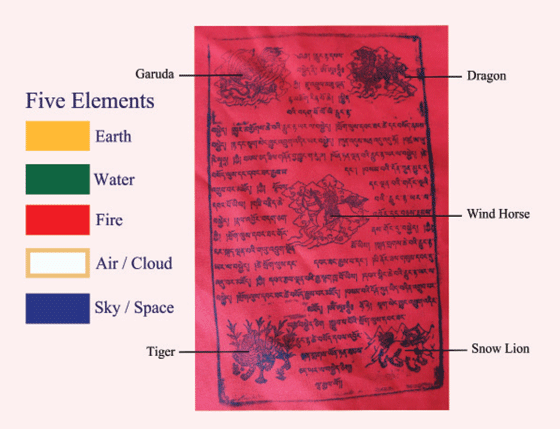 At a deeper level, the Lungta and the four dignities symbolize the play of the five elements, out of which all phenomena are formed. The lungta symbolizes space, the ground of all manifestation. The Tiger symbolizes the wind element; the Snow Lion, Earth; the Garuda, Fire; and the Dragon, Water. Traditionally, they are set out in the same configuration as the five-part Mandala used for the five Buddha families, as can be seen in Lungta prayer flags.