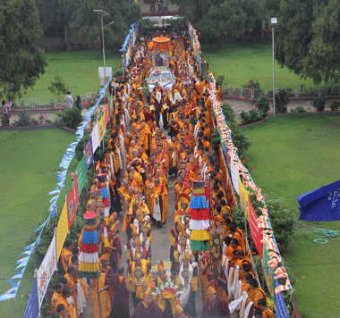 Then, a large holy portrait of Yangsi Rinpoche was carried in a ceremonial procession to the Golden Temple. There it was honored with prayers of auspiciousness, the prayer of venerating the Elders and long life prayers. The General Secretary of Namdroling Monastery read out the programme, followed by an explanation of Mandala offering by Khen Rinpoche Tandin Sithub, the president of NNI. This was followed by the offering of the auspicious substances of body, speech and mind before the holy portrait of Yangsi Rinpoche. After that, the guests, monks, nuns and laypeople offered ceremonial scarves to the holy portrait of Yangsi Rinpoche. Afterwards, a bountiful lunch was served to the guests and the public.
